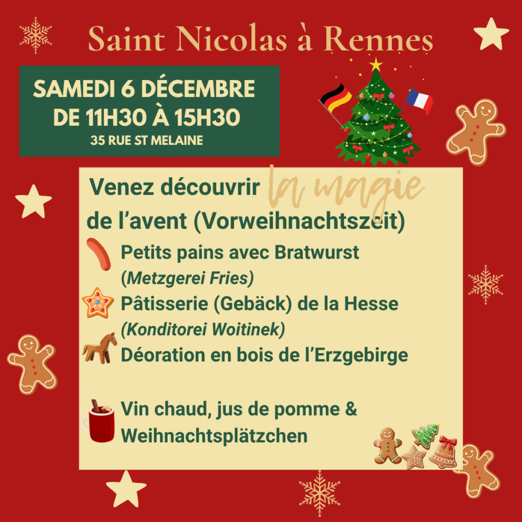 C’est pour cela, le Centre franco-allemand un marché de Noël le samedi 6 décembre de 11h30 à 15h30 (au 35 Rue St Mélaine, Rennes).