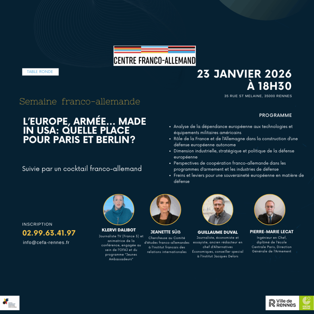 À l’occasion du 23 janvier (semaine et journée franco-allemande), le Centre franco-allemand de Rennes vous invite à une conférence (qui ne pourrait pas être plus d’actualité qu’en ce moment) pour comprendre l’avenir de la relation Franco Allemande en Europe dans un contexte géopolitique bouleversé.